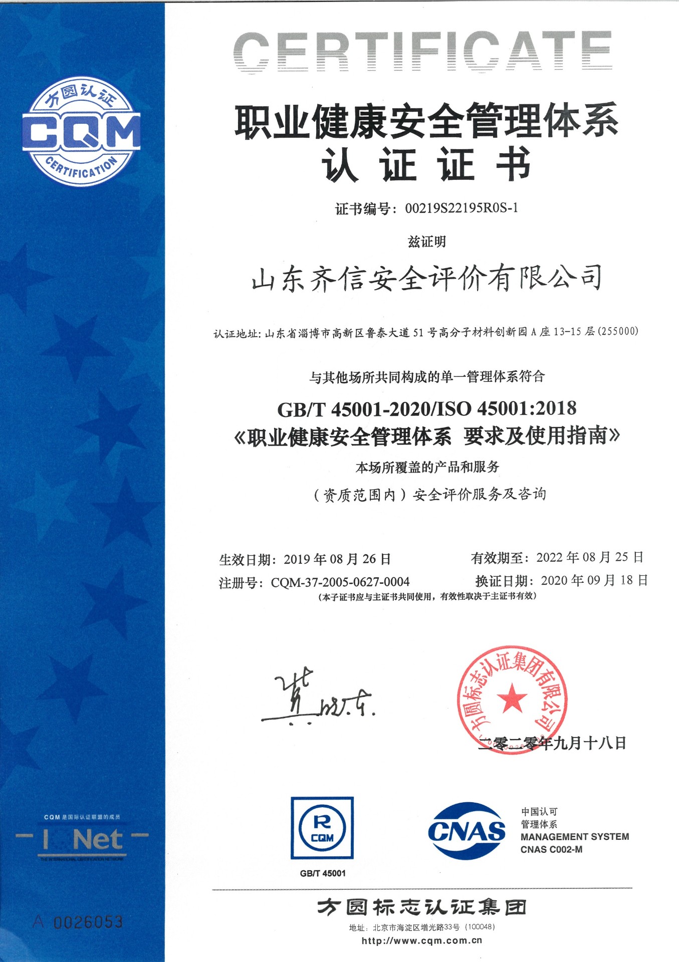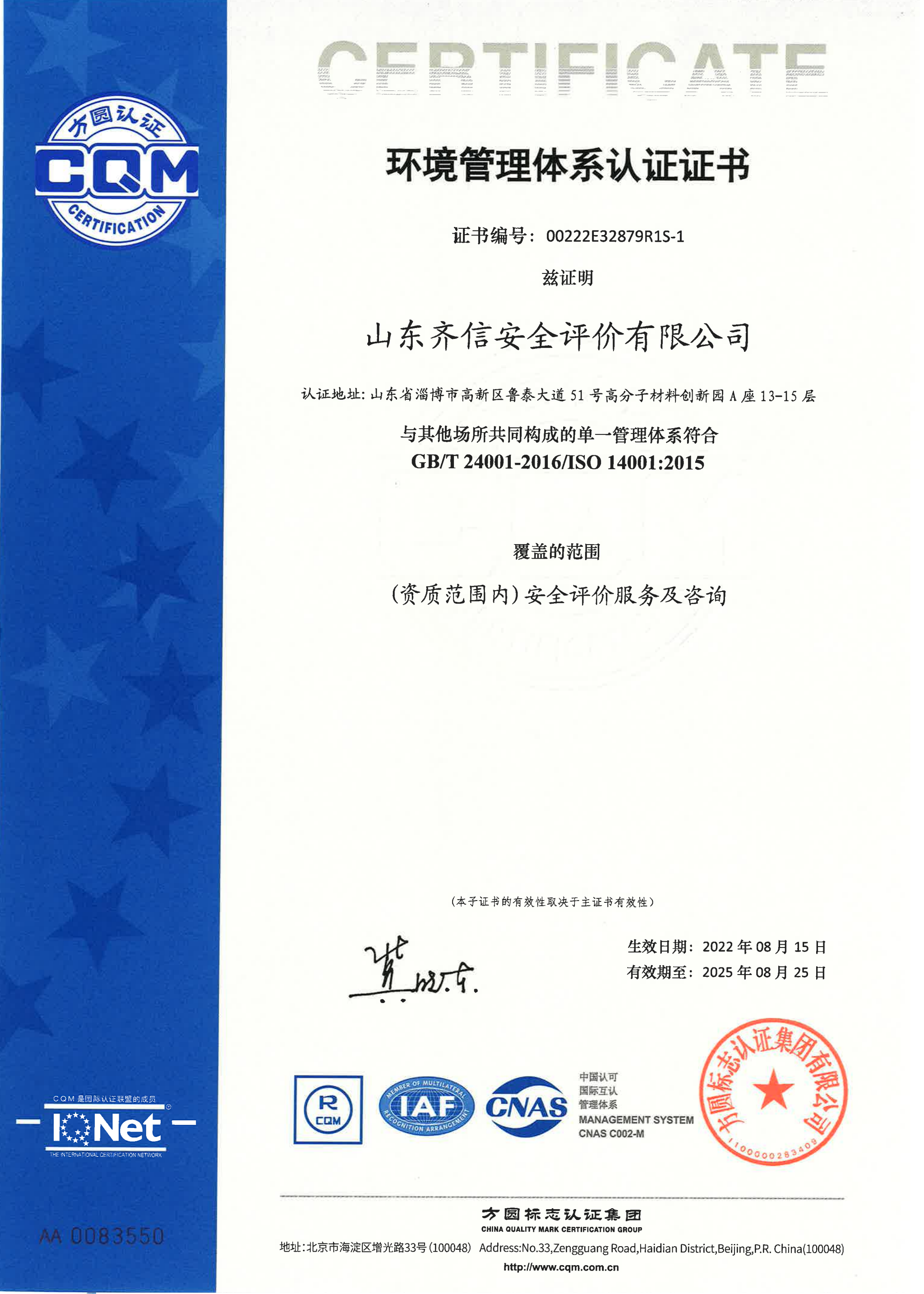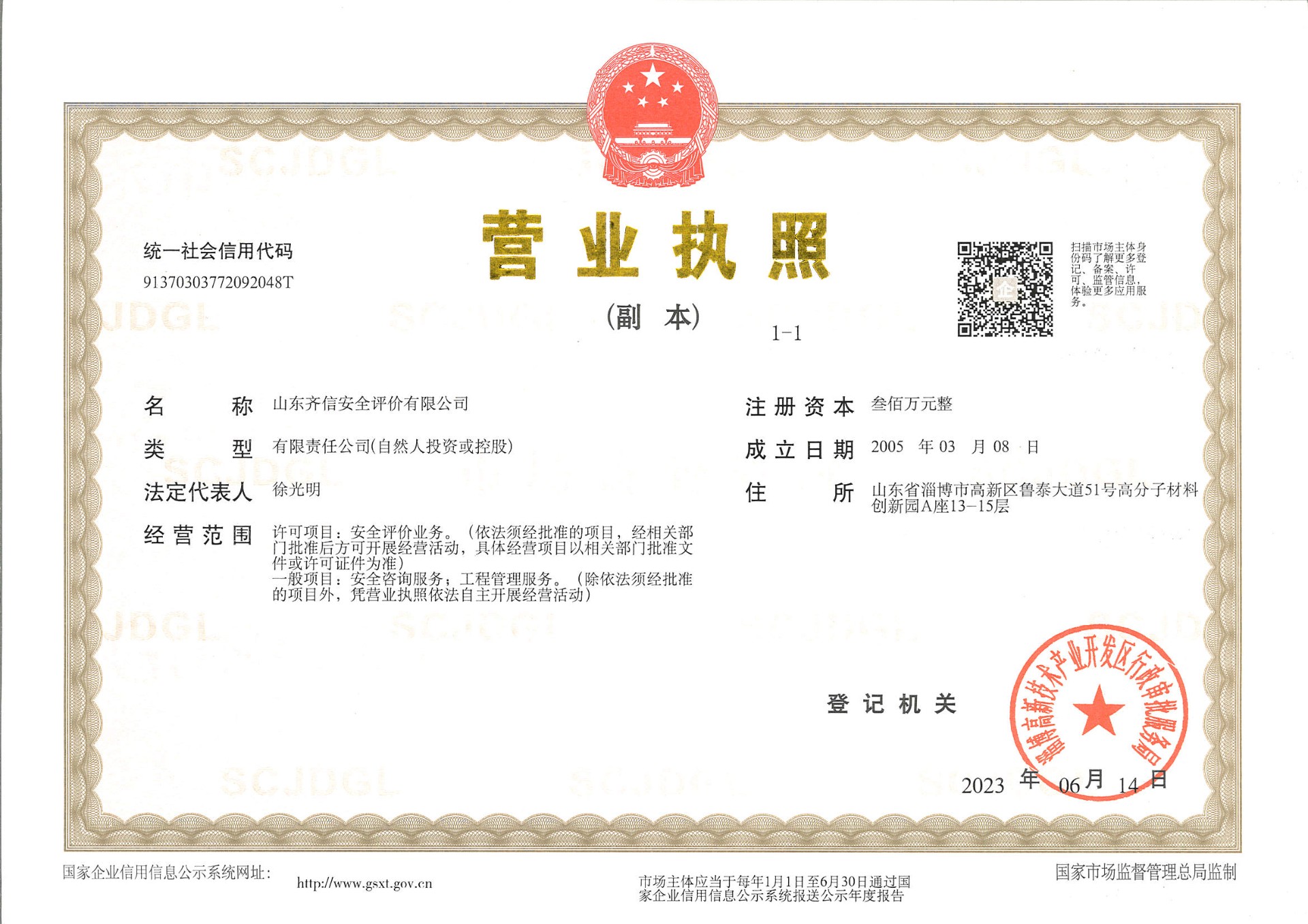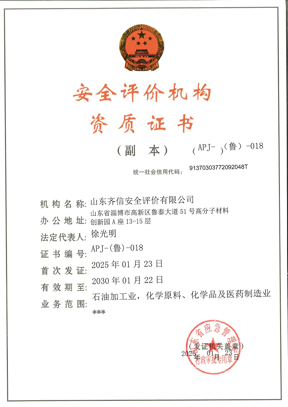 山東齊信安全評價有限公司成立于2005年3月,注冊資本300萬元人民幣,固定資產總值804.8728萬元。法定代表人徐光明,注冊地址及辦公地址位于淄博高新區魯泰大道51號高分子材料創(chuàng)新園A座13-15樓。2005年9月取得安全評價機構乙級資質。自國家應急部1號令實施以來,公司于2020年1月15日取得新安全評價資質,業務范圍包括:陸上油氣管道運輸業;石油加工業,化學原料、化學品及醫(yī)藥制造業;金屬冶煉。2018年12月21日取得安全生產標準化二級評審單位,評審范圍:危險化學品、紡織、建材、輕工、冶金、機械。 公司現有人員41人,其中專職安全評價師37人,注冊安全工程師26人,研究員1人、碩士5人、雙學士1人,山東省安全專家?guī)鞂<?人、教授級高工1人,高級工程師8人、工程師22人,專職危險化學品標準化評審員、工商貿標準化評審員30人,本科以上學